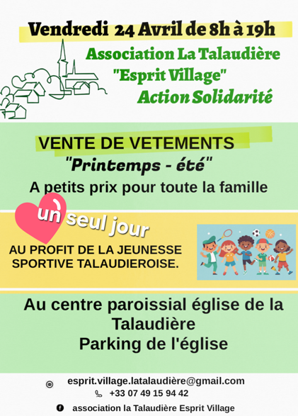 Notre partenaire, l'Association Esprit village, organise une vente de vêtements à petits prix au bénéfice de la jeunesse sportive talaudiéroise. Rendez-vous au Centre Paroissial de La Talaudière