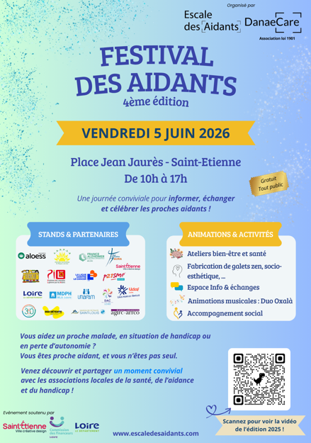 Retrouvez-nous pour la 4ème édition du Festival des aidants avec d'autres partenaires engagés. De nombreuses animations et activités au programme. Place Jean Jaurès à St Etienne